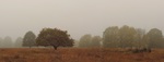 2017eiken op de heide op een mistige dag, ruige stlte.